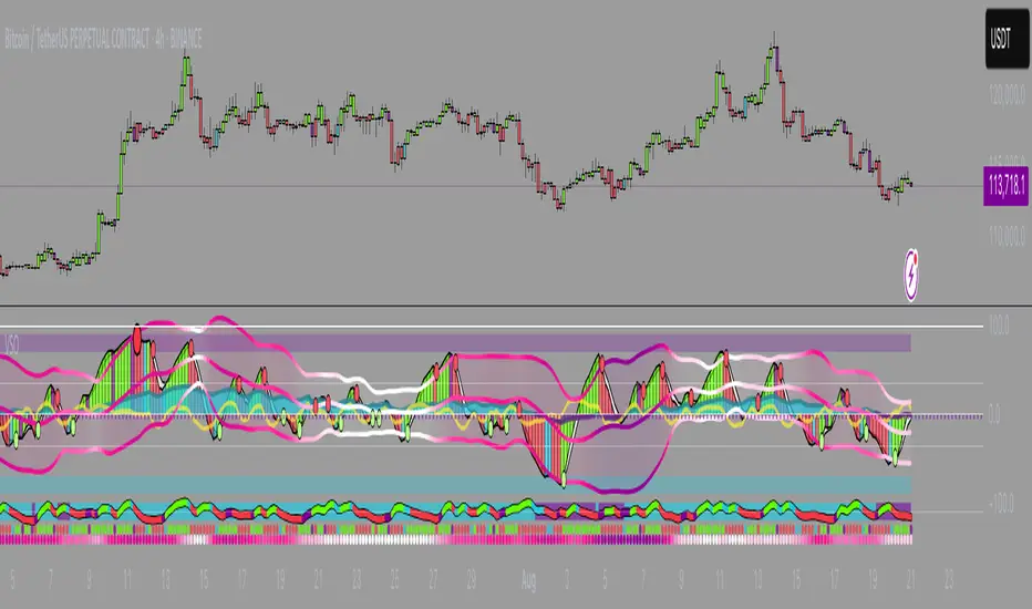This is similar to LazyBear's WaveTrend oscillator but handles momentum calculation differently and has some extra components for trade analysis.