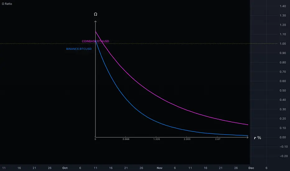 Omega calculates a probability-adjusted ratio of gains to losses, relative to the Minimum Acceptable Return (MAR). This means that at a given MAR using the simple rule of preferring more to less, an asset with a higher value of Omega is preferable to one with a lower value. The indicator displays the values of Omega at increasing levels of MARs and creating the so-called Omega Curve. Knowing this one can compare Omega Curves of different assets and decide which is preferable given the MAR of your strategy. The indicator plots two Omega Curves. One for the on chart symbol and another for the off chart symbol that u can use for comparison.