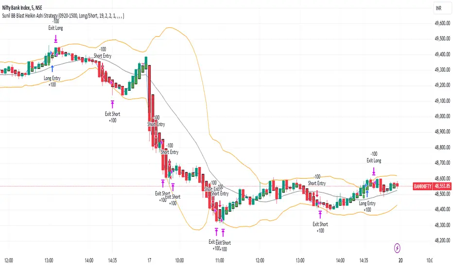The Sunil BB Blast Heikin Ashi Strategy is a trend-following trading strategy that combines Bollinger Bands with Heikin-Ashi candles for precise market entries and exits. It aims to capitalize on price volatility while ensuring controlled risk through dynamic stop-loss and take-profit levels based on a user-defined Risk-to-Reward Ratio (RRR).