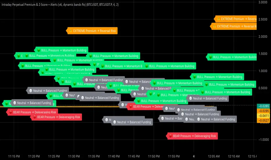 This indicator measures the real-time premium of a perpetual futures contract relative to its spot market and interprets it through a statistical lens.
