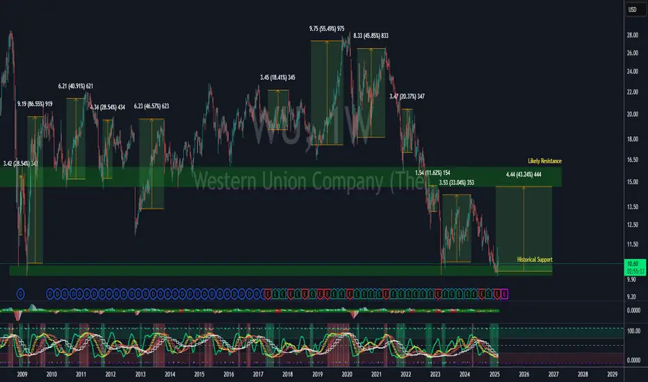 - Color Coded Background - Red indicates green/yellow wave have gone into overbought territory and green background indicates green/yellow wave have gone into oversold territory. White slices in the background indicate the green has crossed (while in overbought/oversold)