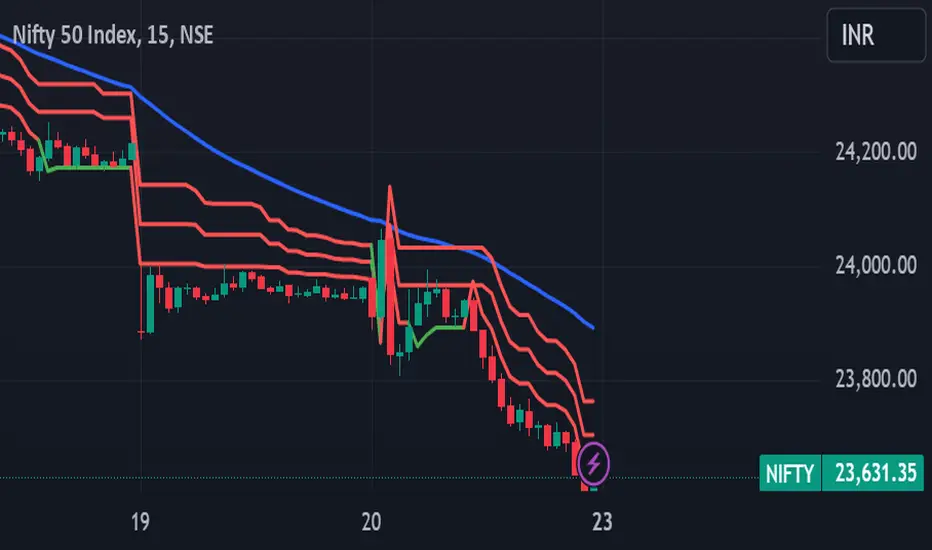 Supertrend 3: Green (for uptrend) and Red (for downtrend).