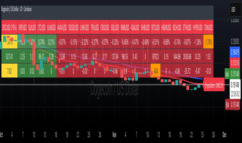 This indicator provides sector-based organisation and real-time performance visualisation for cryptocurrencies. It is not intended to predict price movements or guarantee outcomes. Crypto assets carry significant risk, including loss of capital. Past performance does not guarantee future results. All data and sector classifications are best-effort and may be incomplete, inaccurate, or outdated. Nothing in this script should be interpreted as financial advice. You are solely responsible for your own trading decisions.