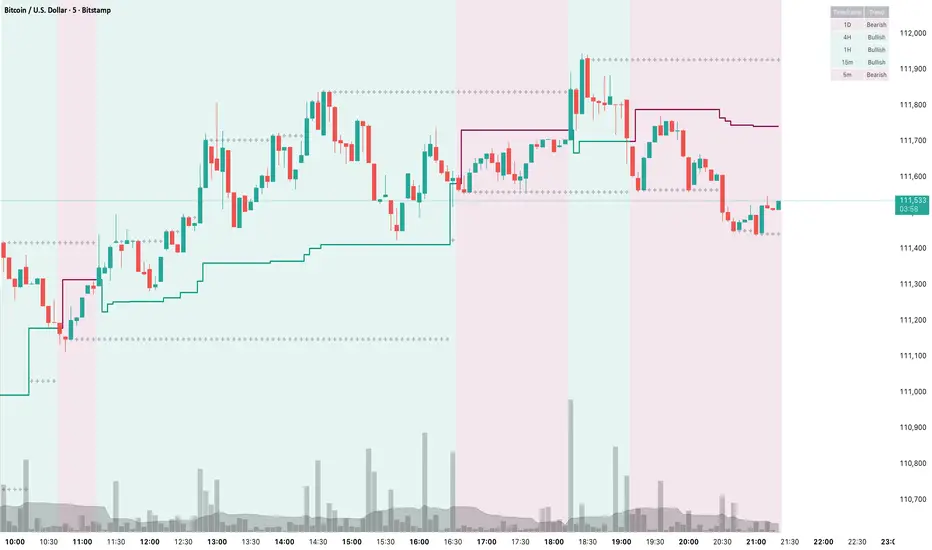 - Multi-Timeframe (MTF) Trend Table: A customizable table is displayed on the chart to provide an immediate summary of the indicator's trend direction across five key timeframes (1D, 4H, 1H, 15m, 5m), giving you instant insight into cross-market directional confluence.