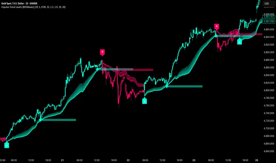 Impulse Trend Levels [BOSWaves] is a momentum-aware trend identification system that tracks directional price movement through adaptive confidence bands, where band width dynamically adjusts based on impulse strength and freshness to reflect real-time conviction in the current trend direction.