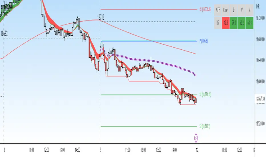 R - RSI (Multi-time frame table is added at the top and traders can add standard RSI 14 as an additional non-overlay indicator)