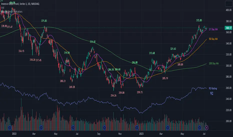 Market Smith has a collection of tools that are useful for identifying stocks. On their charts they have a 21/50/200 day moving averages, high and low pivot points, a relative strength line, and a relative strength rating. This script contains indicators for the following: