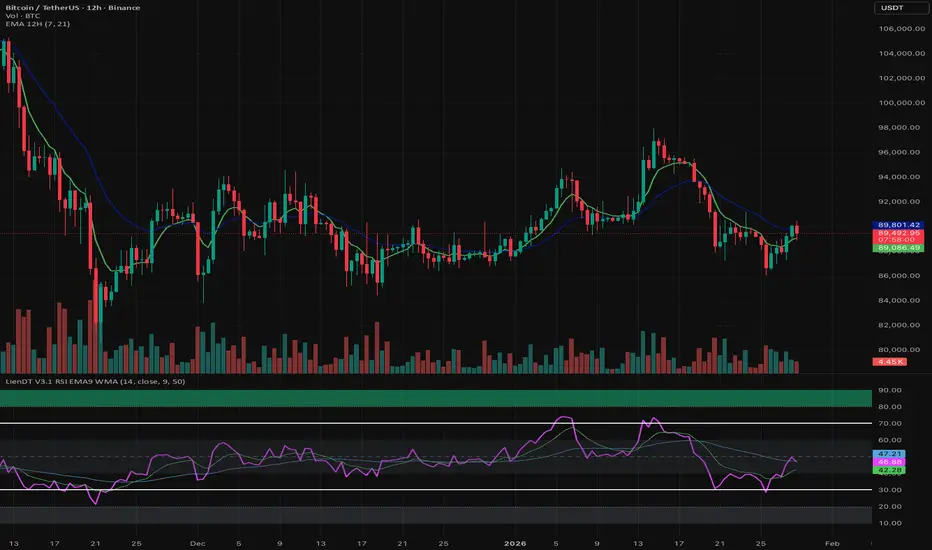 This script visualizes the interaction between a fast-moving momentum line (EMA 7) and a short-term trend baseline (EMA 21). This specific combination on the 12H chart is often considered a "Sweet Spot" for identifying multi-day trends in volatile markets like Crypto and Forex.