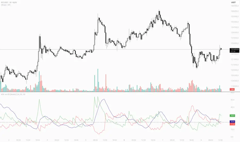 Plots +DI, −DI, and ADX to gauge trend strength and direction. DI Length controls the directional movement calculation; ADX Smoothing sets the RMA period for ADX; ADX Threshold draws a reference line for identifying strong-trend regimes. A rising ADX indicates strengthening trend; +DI above −DI suggests bullish momentum, and vice versa.