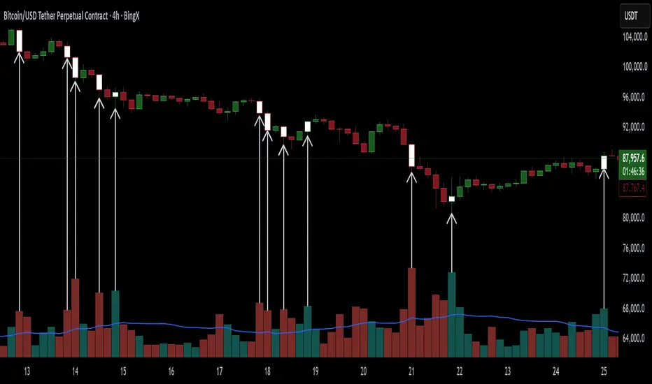 A simple indicator that identifies spikes in volume and marks the specific candle with based on the user's preferences.