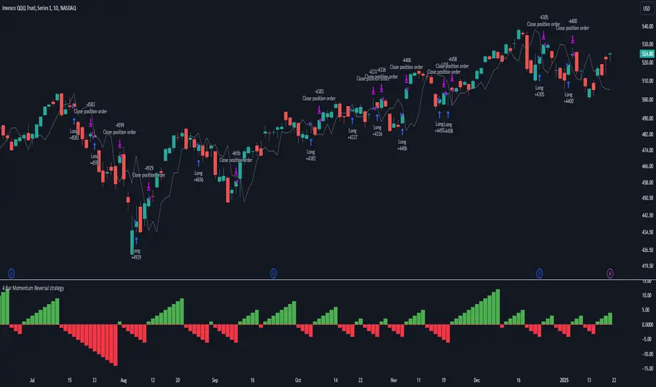 The "4 Bar Momentum Reversal Strategy" is a mean-reversion strategy designed to identify price reversals following a sustained downward move. It enters a long position when a reversal condition is met and exits when the price shows strength by exceeding the previous bar's high. This strategy is optimized for indices and stocks on the daily timeframe.