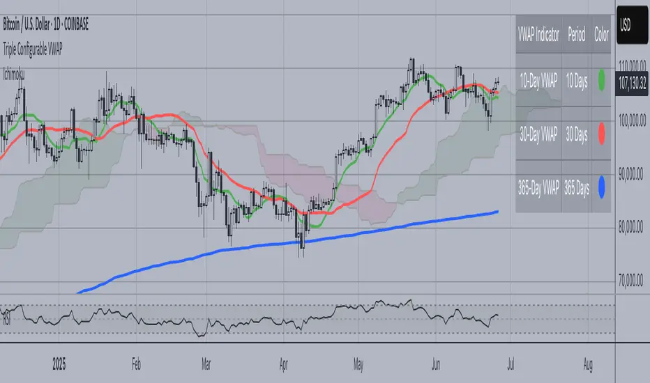 Triple Configurable VWAP IndicatorThis advanced VWAP (Volume Weighted Average Price) indicator displays three independently configurable VWAP lines on your chart, providing multiple timeframe perspectives for better trading decisions.