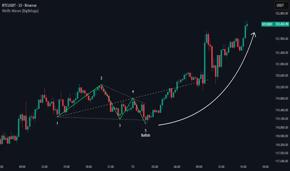 The Wolfe Waves [BigBeluga] indicator automatically detects these patterns in real time. It tracks sequences of five pivots (points 1 through 5) and connects them with wave lines. Users can select either Bullish or Bearish Wolfe Waves depending on their trading bias. When the pattern fails, the lines automatically turn red to highlight invalidation.