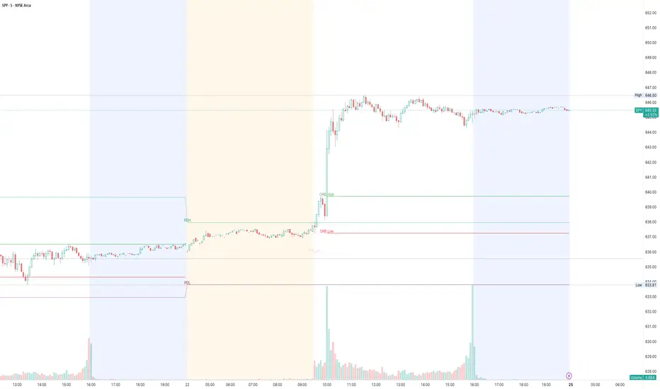 - Opening Range (ORB): Calculates and displays the high and low of a user-defined opening period (e.g., the first 30 minutes). The levels appear only after the range is established.