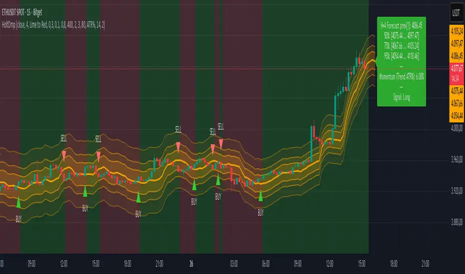This indicator applies damped exponential smoothing to generate forward price forecasts, displaying them as probabilistic fan bands to highlight potential ranges rather than point estimates. It incorporates residual-based uncertainty to make projections more reliable in varying market conditions, reducing overconfidence in strong trends. Momentum from the trend component is shown in an optional label alongside signals, aiding quick assessment of direction and strength without relying on lagging oscillators.