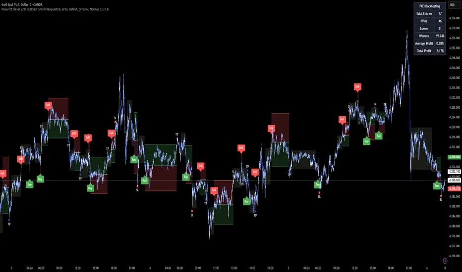 This script is a full PO3 (Accumulation → Manipulation → Distribution) engine based on ICT concepts, but implemented in a highly automated, state-machine style. It actively scans for PO3 cycles, validates them with ATR-based volatility thresholds, and then auto-generates entries, exits, alerts, and visual zones.