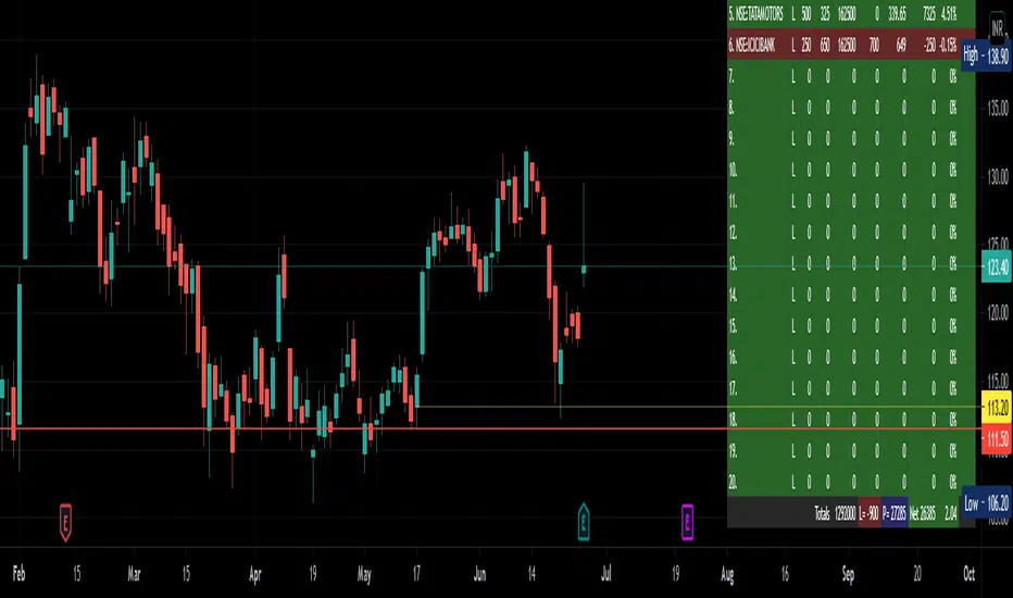 This is a useful indicator that sits on top of the charts, in the right hand bottom corner and shows the current price, profit or loss in value and percent of upto 20 scrips fed in, in a Tabular form using tables feature.Allows to mark a/c id also if you have multiple broker or individual accounts.