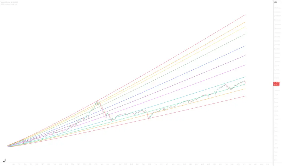 This indicator creates a set of logarithmic growth curves specifically calibrated for the Nasdaq 100 index, providing a long-term perspective on market cycles and potential price ranges.