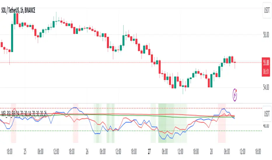 Merging Money Flow Index (MFI), Relative Strength Index (RSI), and Bollinger Bands in TradingView can offer traders a comprehensive view of market conditions, providing insights into potential price reversals, overbought or oversold conditions, and potential trend changes. Here are some benefits of combining these indicators: