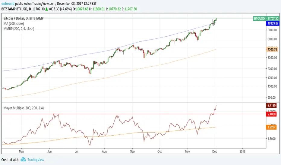 Following Preston Pysh's "Bitcoin Mayer Multiple" study, I made this simple script to plot the Mayer multiple by calculating the ratio between bitcoin price and its 200-day moving average. It also plots the moving average of ratio itself.