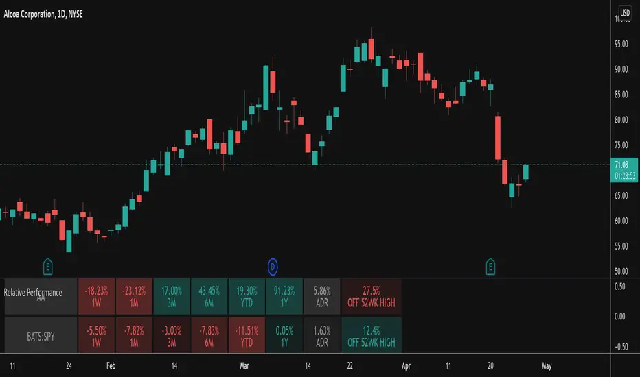 This indicator takes the Performance Table from BeeHolder and converts it to a Relative Performance table so you can compare the current chart vs. an Index (or whatever other ticker you want) to see the relative performance of one vs. the other. I also added a cell for ADR, which is also the same value as "Monthly Volatility" in the stock screener. This can be useful when screening stocks based on performance and volatility.