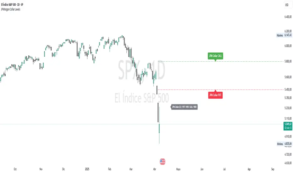 This indicator visualizes the current JPMorgan Hedging Collar strategy commonly used by institutional funds like JHEQX. It plots three key levels: