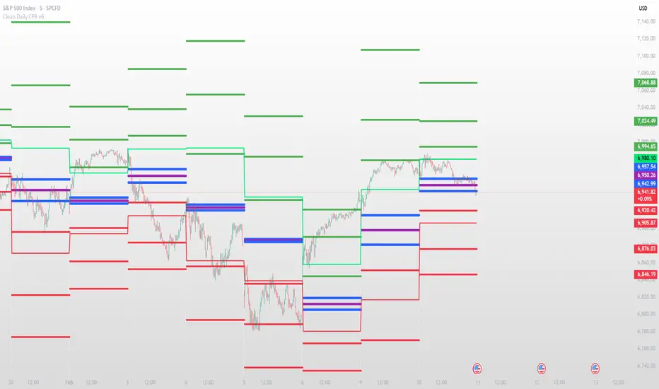 This indicator plots clean and non-repainting Daily Central Pivot Range (CPR) levels along with R1/R2/R3 and S1/S2/S3, all calculated from the previous trading session.