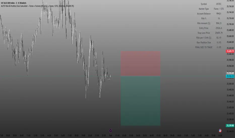 indicator("AUTO Risk & Position Size Calculator – Forex + Futures", overlay=true)
