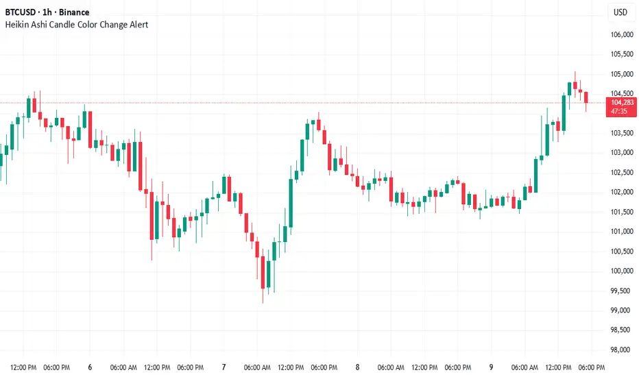 This is Heikin Ashi Candle Color Change Alert. Add it to your chart then create an Alert with your preferences. It indicates when a candle color change occurs.