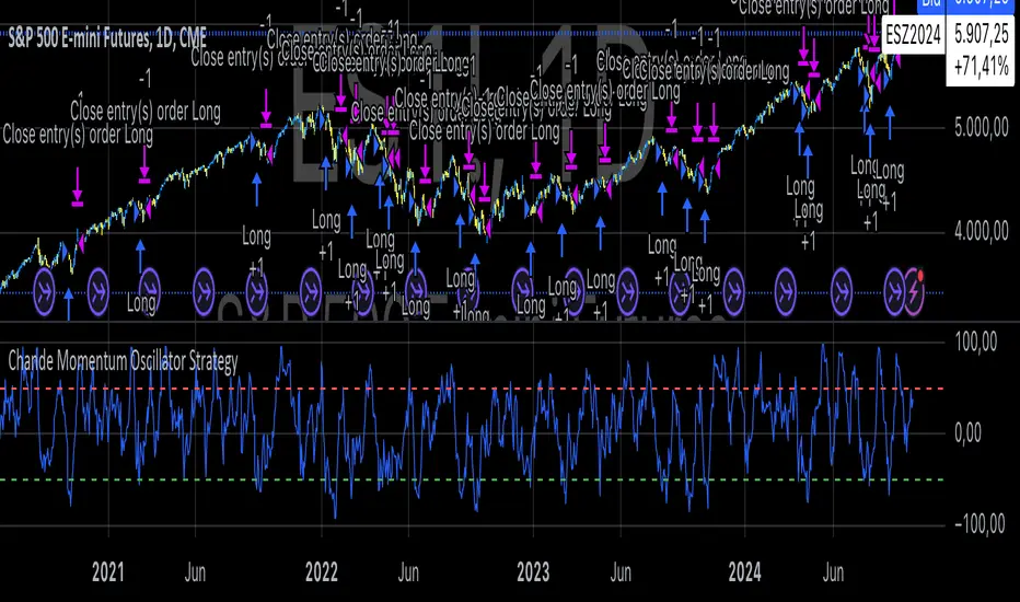 The Chande Momentum Oscillator (CMO) Trading Strategy is based on the momentum oscillator developed by Tushar Chande in 1994. The CMO measures the momentum of a security by calculating the difference between the sum of recent gains and losses over a defined period. The indicator offers a means to identify overbought and oversold conditions, making it suitable for developing mean-reversion trading strategies (Chande, 1997).
