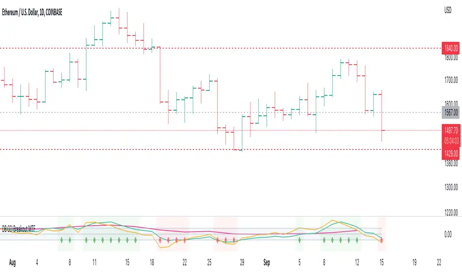 The indicator will display crypto breakout and fallouts based on 4 timeframe CCI values. By default the current chart timeframe is used and the user may chose 3 other timeframes in the settings. Additionally, the symbol may be configured in the indicator settings. Default is Coinbase:ETHUSD.