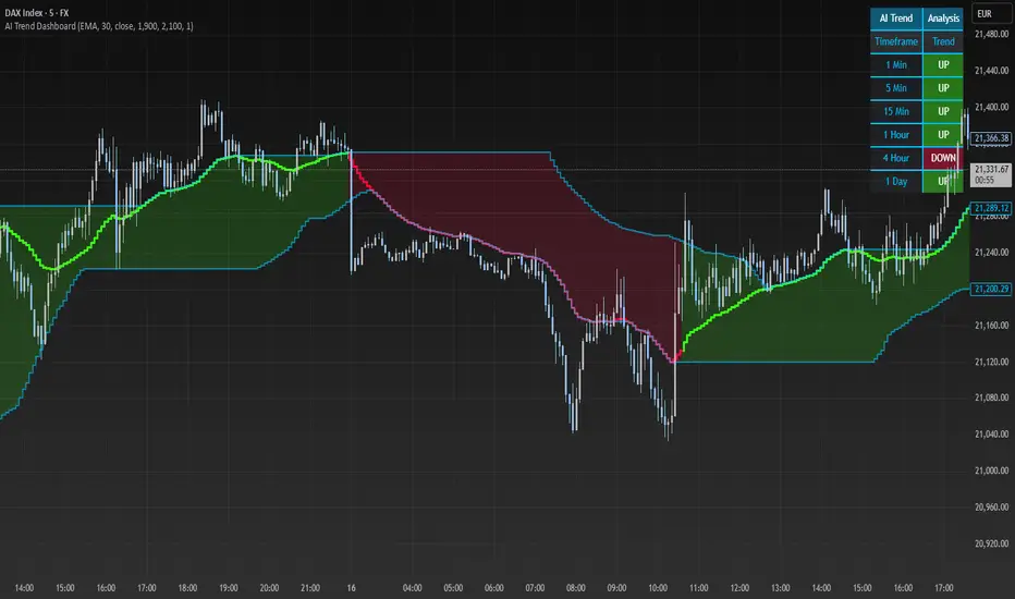 This indicator identifies trends on your chart using a dynamic price channel and provides buy and sell signals based on trend alignments across multiple timeframes. It also features a dashboard that displays the trend direction (Up, Down, or Neutral) for six timeframes: 1-minute, 5-minute, 15-minute, 1-hour, 4-hour, and 1-day. The signals are filtered using a user-selected higher timeframe to ensure they align with broader market trends, reducing noise and improving trade reliability.
