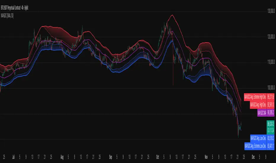 MA%DC calculates the percentage deviation of High and Low from the chosen MA and stores these values in arrays. Based on the average deviation values, the script plots four key levels: