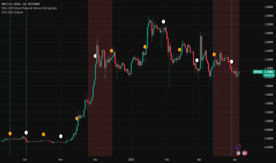 Works best on daily or higher timeframes for clear visibility of individual eclipse dates, though it functions on any TradingView-supported timeframe.