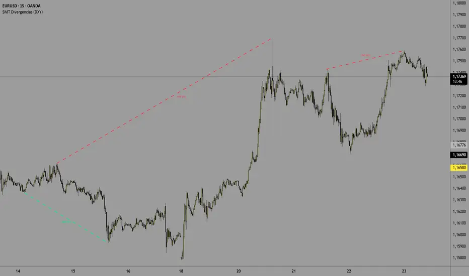 SMT Divergences is a Smart Money Technique (SMT) divergence detector that compares the asset you are trading with a comparative index (by default, the DXY).