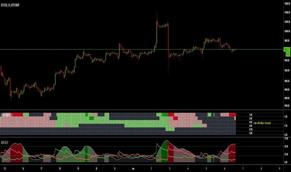 Monitoring panel showing the ADX (Average Directional Index) & DMI (Directional Movement Index) as color code for 6 different timeframes.
