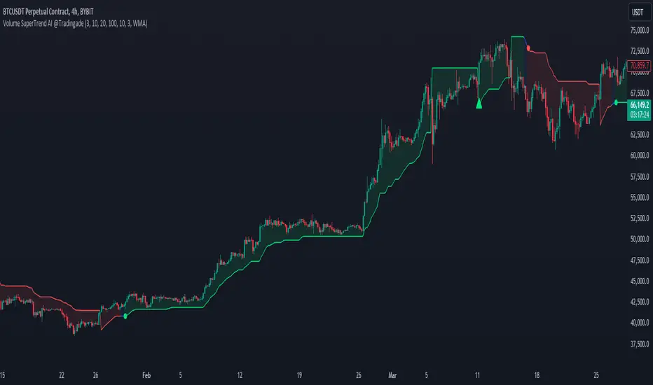 The Volume SuperTrend AI combines traditional SuperTrend calculations with advanced AI techniques, specifically the k-nearest neighbors (KNN) algorithm.