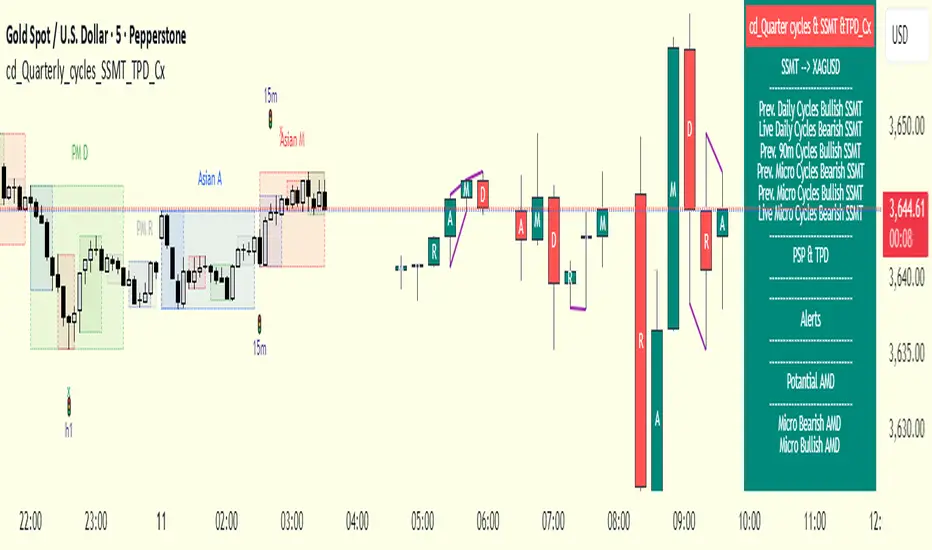 Additionally, it performs inter-cycle divergence analysis (SSMT) with the correlated symbol, Terminus Price Divergence (TPD), Precision Swing Point (PSP) analysis, and potential Power of Three (PO3) analysis.