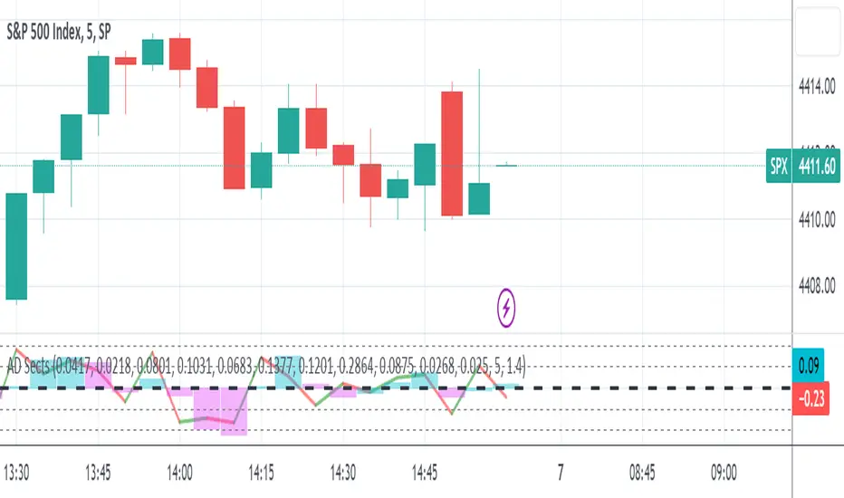 sectors up) and -500 (all sectors down). This weighted AD line of sectors is scaled to +/- 350 and plotted as a red/green line