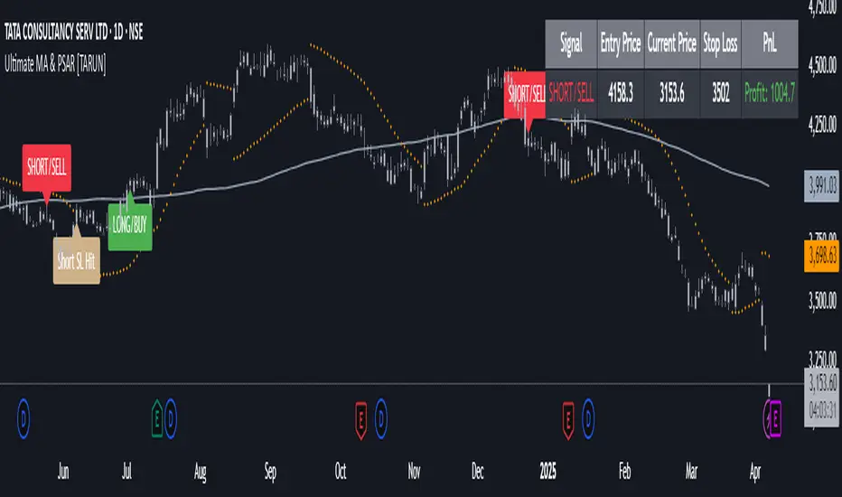This indicator combines a customizable Moving Average (MA) and Parabolic SAR (PSAR) to generate precise long and short trade signals. A dashboard displays real-time trade conditions, including signal direction, entry price, stop loss, and PnL tracking.