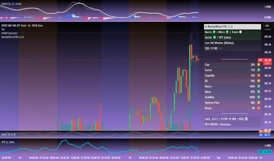 By fusing macro alignment, sector flow, liquidity quality, volatility regime, microstructure behavior, and options-driven pressure into a single visual framework, 🜁 MarketMind PRO turns noisy charts into clean, decision-ready environments.