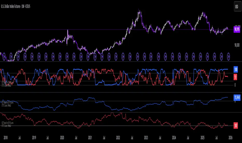 - Index (0–100) – normalized net positions to identify bullish or bearish extremes (standard cycle: 26 weeks, optionally 52 weeks).