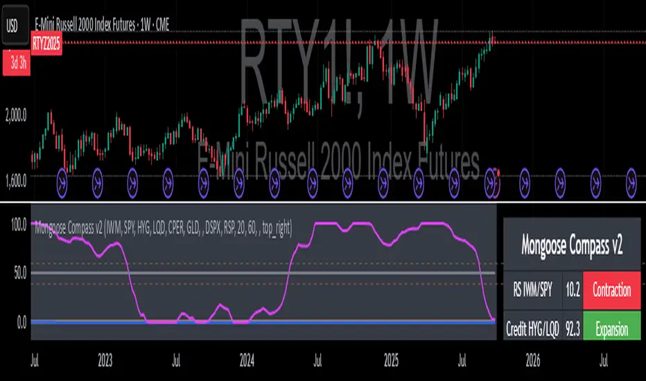 Mongoose Compass v2 is a regime‐detection dashboard and optional price-chart ribbon. It combines four market “pillars” into a 0–4 score and a suggested equity beta/position size. It is scale-independent and works on any host symbol.