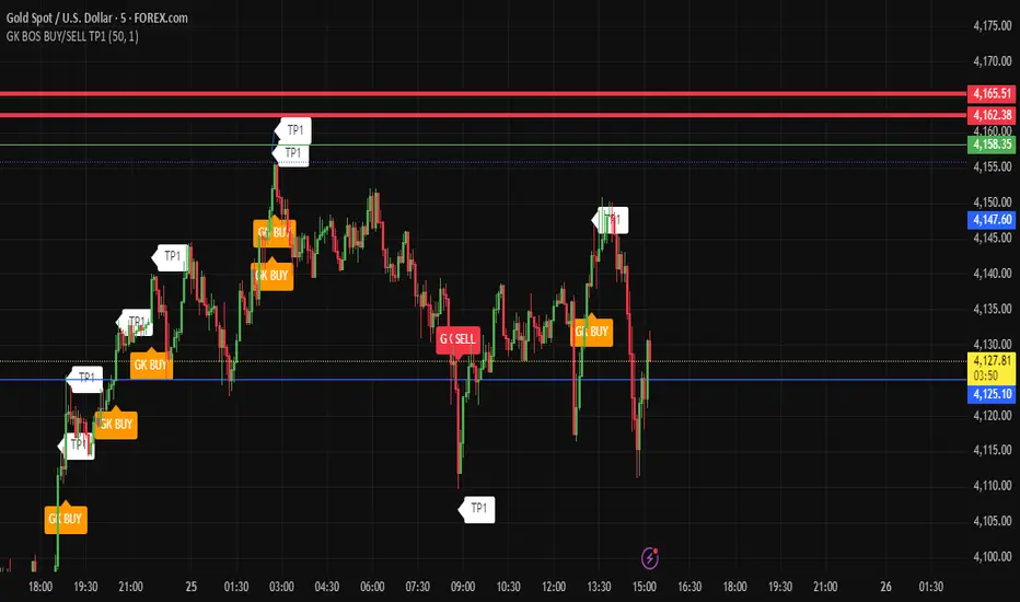 When a major bullish or bearish structure breaks occurs, the indicator marks the chart with a GK BUY or GK SELL label.