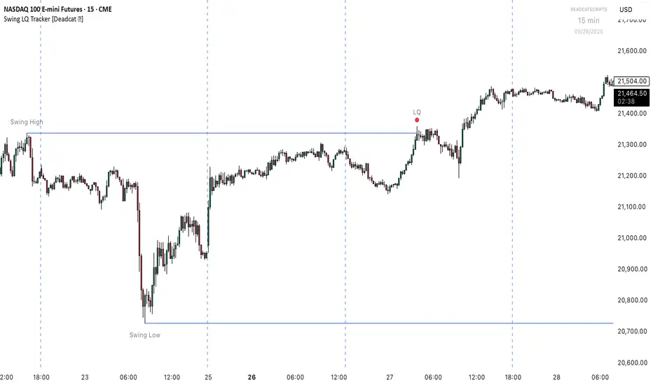 An interactive tool to track liquidity events. Select start and end points on your chart—this indicator will automatically detect and plot the highest high and lowest low from that window, then extend those levels forward. If price sweeps either level, it marks the event with a clean "LQ" tag.