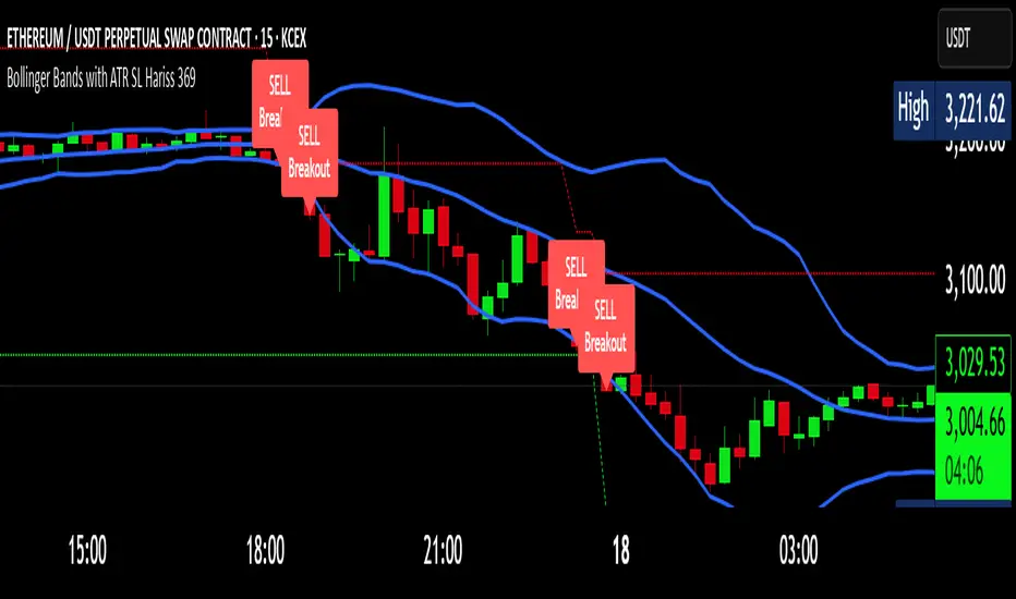 Bollinger bands indicator is basically a trend following indicator. We should go with the trend rather book profit 1:1 or 1:2 basis. In that case we might miss the long trend. The middle band is generally considered as stop loss. However, ATR based stop loss has been designed in the script in order to capture the volatility in decent way.