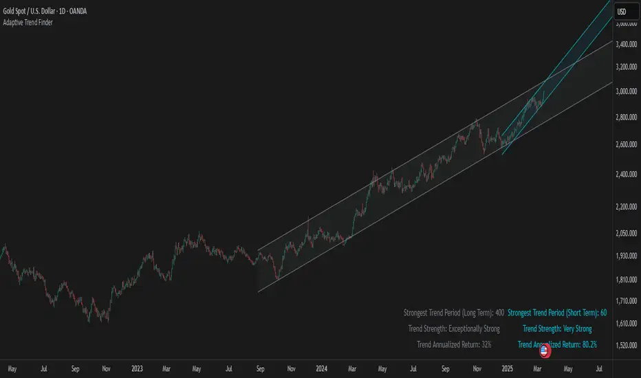 Adaptive Trend Finder stands out as one of the most advanced trend analysis tools available on TradingView. Unlike conventional trend indicators, which rely on fixed parameters or lagging signals, Adaptive Trend Finder dynamically adjusts its settings based on real-time market conditions. By combining automatic trend detection, dual-channel visualization, real-time performance metrics, and an intuitive user interface, this indicator offers an unparalleled edge in trend identification and trading decision-making.