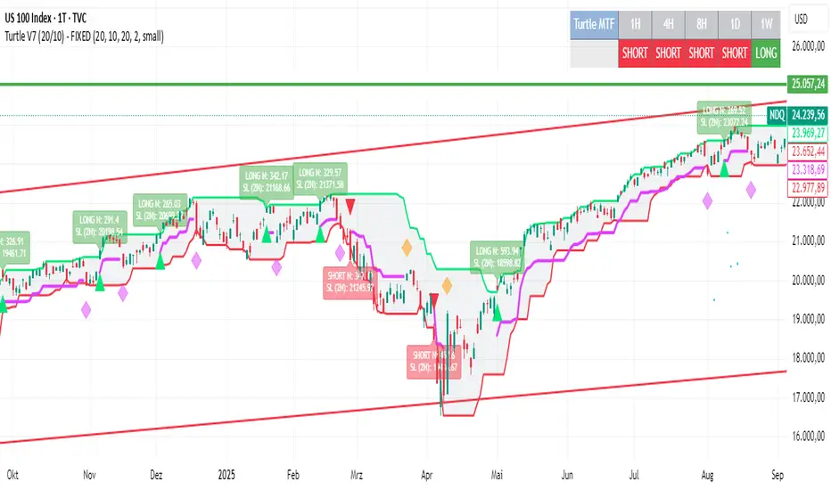 SETS the initial and Trailing Stop at $\mathbf{2N}$.🛠️ Key Technical Features1. Original Turtle Trailing Stop (Section 4)The stop-loss mechanism is implemented with the historically accurate Turtle Trailing Logic. The stop is not aggressively tied to the current candle's low/high, which often causes premature exits. Instead, the stop only trails in the direction of the trend, maximizing the previous stop price against the new calculated $\text{Close} \pm 2N$:$$\text{New Trailing Stop} = \text{max}(\text{Previous Stop}, \text{Close} \pm (2 \times N))$$2. Reliable Multi-Timeframe (MTF) Status (Section 6)The indicator features a robust MTF status table.Purpose: It calculates and persistently stores the Turtle System 1 status (LONG=1, SHORT=-1, FLAT=0) for various timeframes (1H, 4H, 8H, 1D, and 1W).Method: It uses global var int variables combined with request.security(), ensuring the status is accurately maintained and updated across different bars and timeframes, providing a reliable higher-timeframe context.3. VisualizationsChannels: The 20-period (Entry) and 10-period (Exit) Donchian Channels are plotted.Stop Line: The dynamic $\mathbf{2N}$ Trailing Stop is visible as a distinct line.Signals: plotshape markers indicate Entry and Exit.MTF Table: A clean, color-coded status summary is displayed in the upper right corner.