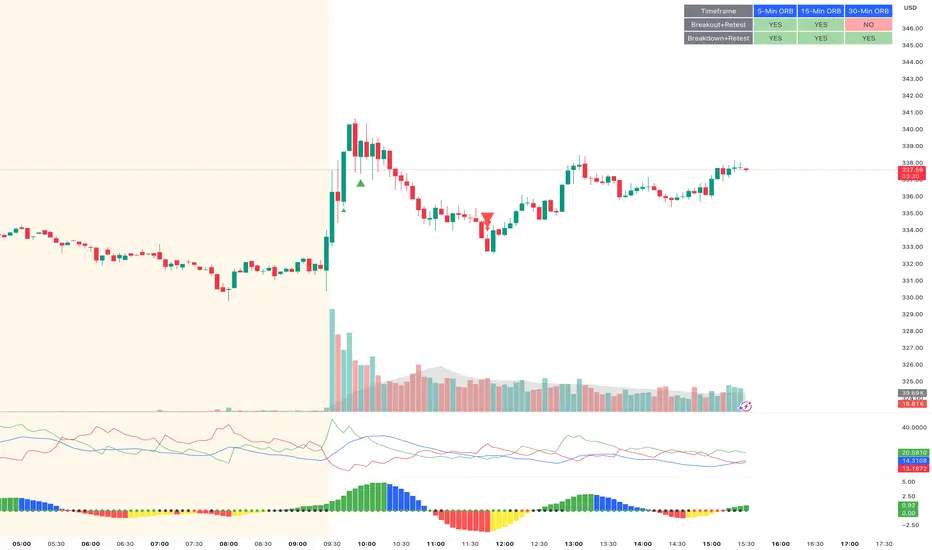 The ORB (Opening Range Breakout) Breakout & Retest Indicator is a simple tool designed to identify opening range breakouts and breakdowns with retest confirmation. This indicator works on ANY timeframe while automatically analyzing 1-minute price action to detect precise entry signals.
