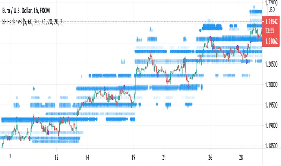 Just like real radar, it searches within 5 ATR of the current price for strong pivots thousands of bars previous major pivots. But that is just the start. Then when a level is respected with a wick rejection a upvote is cast. When the level is busted a downvote is cast. The shading levels are based on the levels POWER as scored by the market voting on it. (Notice the purple dots at then end of the wicks that hit the level) Using this novel technique high probability pivot points are calculated IN ADVANCE so you know the important levels ahead of time.